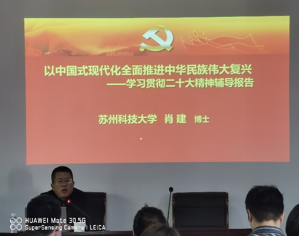 此次党日活动来到了位于吴中区临湖镇的乡村振兴学堂。首先,总支邀请了苏州科技大学马克思主义学院肖建教授讲述了“以中国式现代化全面推进中华民族伟大复兴——学习贯彻二十大精神辅导报告”。沉浸式党课教育让师生党员充分认识到党的二十大的重大意义和丰富内涵,迅速掀起大家学习的热潮,接受传统文化的熏陶和洗礼。