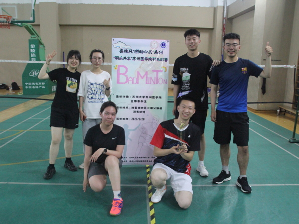 5月28日,由苏州大学苏州医学院学工办、团委主办,苏州大学苏州医学院学生会承办的“羽乐共享”苏州医学院羽毛球赛在独墅湖校区拉开帷幕。在队长仲亿的带领下,我院临八儿科专业组成6人小队参加比赛。