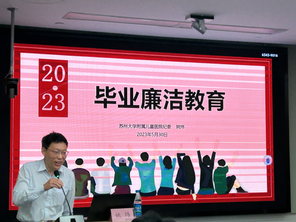时光荏苒,忽然今夏。苏州大学苏州医学院儿科临床医学院2023届研究生毕业在即,即将奔赴各自的职业生涯。为深入践行立德树人根本任务,站好教书育人最后一班岗,5月30日上午,儿科临床医学院举办了一次廉洁主题班会,特邀请苏州大学附属儿童医院党委委员、纪委书记姚炜给毕业生们做廉洁从业主题教育。主题班会由儿科临床医学院总支书记朱振洪主持,医院纪委办公室主任安芳芳、干事宋佳,以及研究生辅导员徐继军、黄筱玥到会,2023届全体毕业研究生参会。