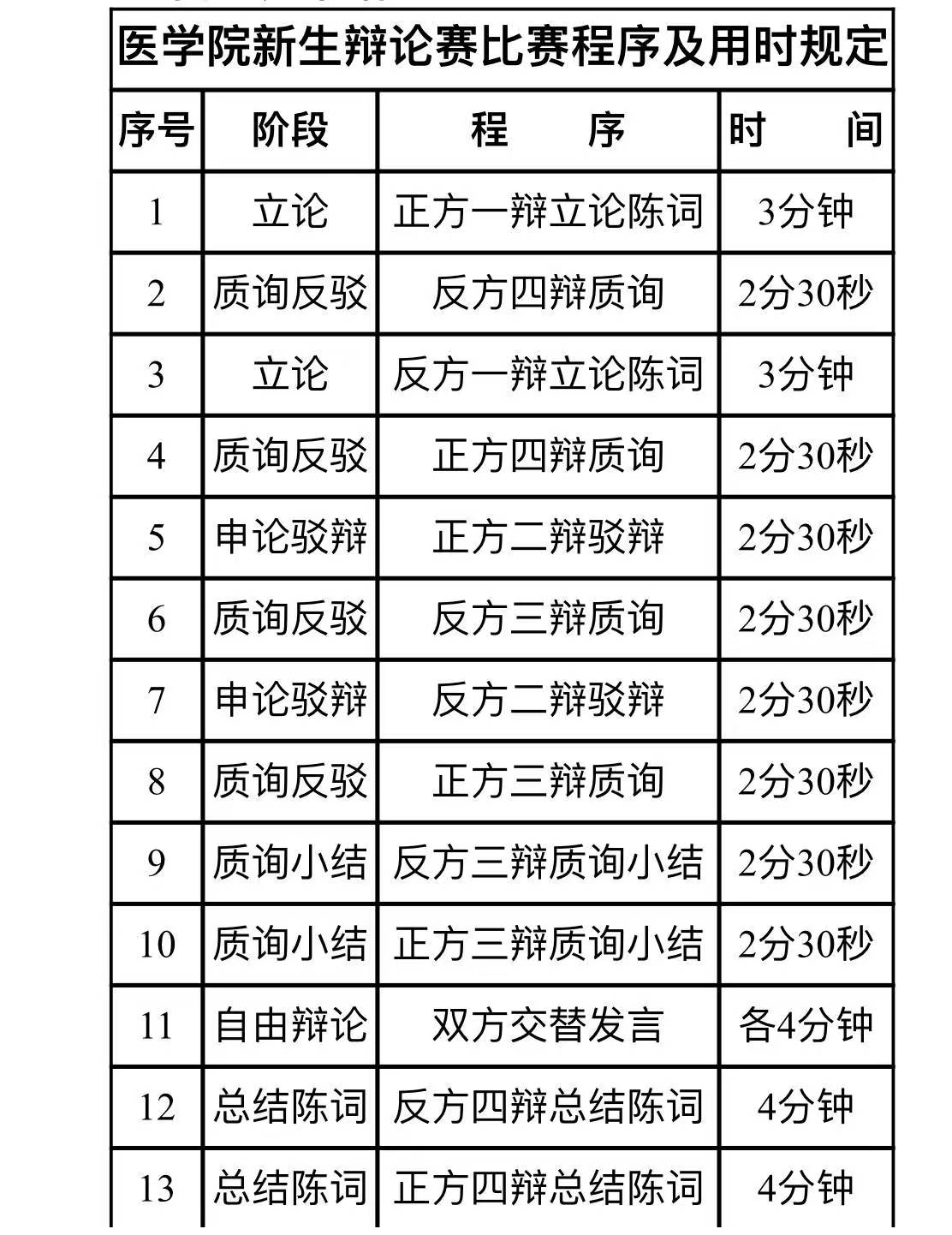 由儿科班(五年制)四个年级和儿科班(5+3一体化)四个年级分别组成上下半区。通过初赛从8支队伍中决出获胜的4支队伍晋级半决赛;通过半决赛从4支队伍中决出获胜的2支队伍晋级决赛;通过决赛从2支队伍中决出1支优秀辩论队伍获胜。
