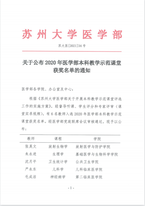 为了进一步推进课程建设,有效提高课堂教学效率,苏州大学医学部开展了本科教学示范课堂评选工作,经督导听课、学生评分和专家评审(课堂实录视频),有6位教师入选2020年医学部本科教学示范课堂获奖名单,其中我院严永东老师承担的《儿科学》课程教学获此荣誉。