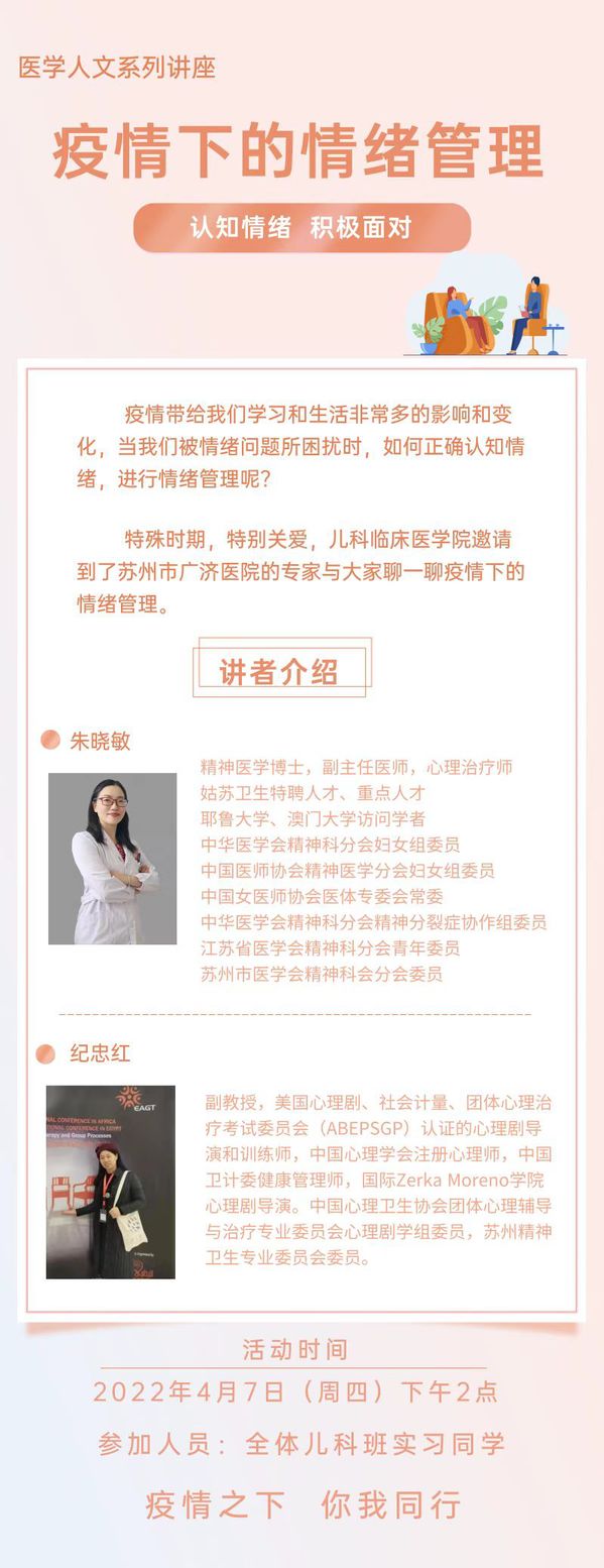 疫情的波动给学生的学习生活带来了许多影响。2017级儿科班学生分散在苏州、上海、无锡、常州实习,在经受疫情考验的同时,同学们还需按时进行线上实习,准备考研的笔试及面试。尤其在上海实习的同学,此时面对的压力更大。此次,为帮助学生缓解因疫情而产生的心理压力,提升学生心理调节能力,我院举行了“疫情下的情绪管理”主题讲座。