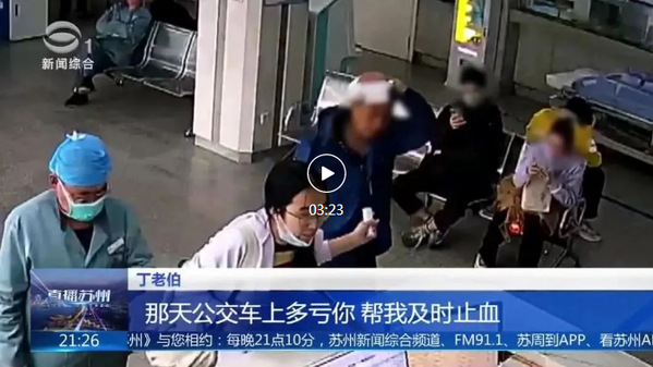 近日,苏州大学苏州医学院儿科临床医学院学生沈旭雯在乘坐公交车时,及时帮助受伤老人处理伤口,一路护送他去医院,事后却默默离开,老人深表感谢。