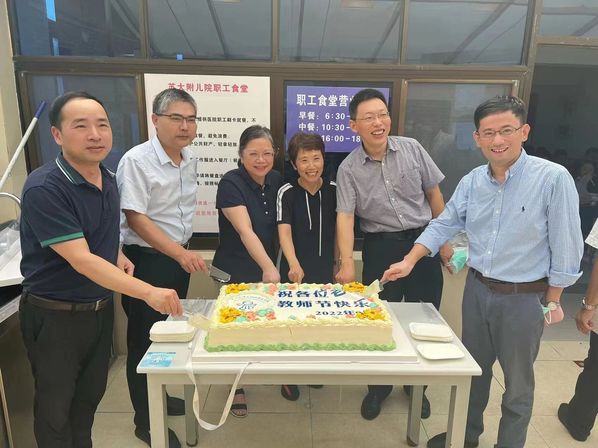 金秋九月,硕果满枝,今年的教师节与中秋节同时到来。在喜庆的节日里,儿科临床医学院办公室受院党政领导委托,为全院教师定制了节日蛋糕。院领导汪健、王晓东、姚炜、吕海涛,儿科临床医学院办公室主任黄洁、副主任朱振洪,各教研室主任、临床科室主任、部分教师代表等,在两院区食堂共聚,庆祝教师节的到来。蛋糕在愉快的氛围中食用完毕,节日的庆祝由此拉开序幕。