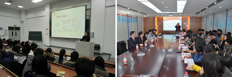 3月13日晚上,儿科临床医学院院长王晓东带领学院各教研室主任、学院办老师及2010级儿科学课程组的学生来到苏州大学医学部独墅湖校区301-1116教室,专程为2011级临床医学专业学生的“儿科学课程组选读” 举办一场精彩的招生宣讲活动。在医学部学工办主任黎春虹主持下,王晓东院长轻快地走上讲台。在风趣的开场白之后,王院长介绍了儿科医学事业的概况、良好的发展前景和儿科医生的紧缺性,并简要介绍了附属儿童医院的概况和教学资源。随后,他结合当下医疗环境提出了“医生就是实践者”的观点。他说要成为医生必须要有健全的体魄、良好的沟通能力、丰富的知识储备。接着王院长介绍了我院的人才培养模式和教学方式,课程组主要采用书院制、导师制和小班授课的精英人才培养方式。最后,王院长对儿科临床医学院的奖学金、助学金做了详细的说明,并回顾了近三届儿科方向学生令人满意的毕业率和就业率,他鼓励大家好好学习、安心学习。现场爆发出阵阵热烈的掌声。